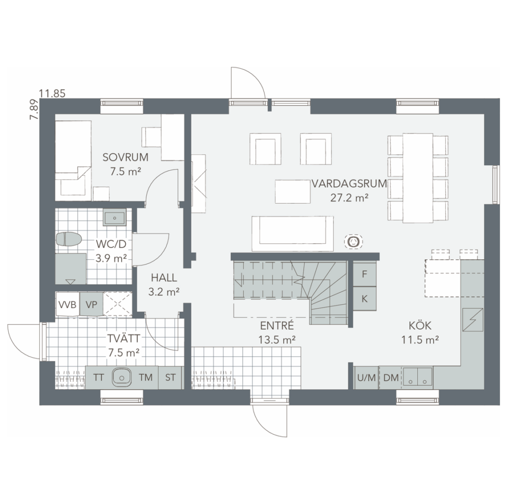 Stilrent tvåplanshus med praktiska lösningar för en organiserad vardag. I den generösa entrén finns det gott om plats när hela familjen ska i väg samtidigt på morgonen. Detta hus kan fås i tre olika stilar: Traditionell, modern eller ladhus.