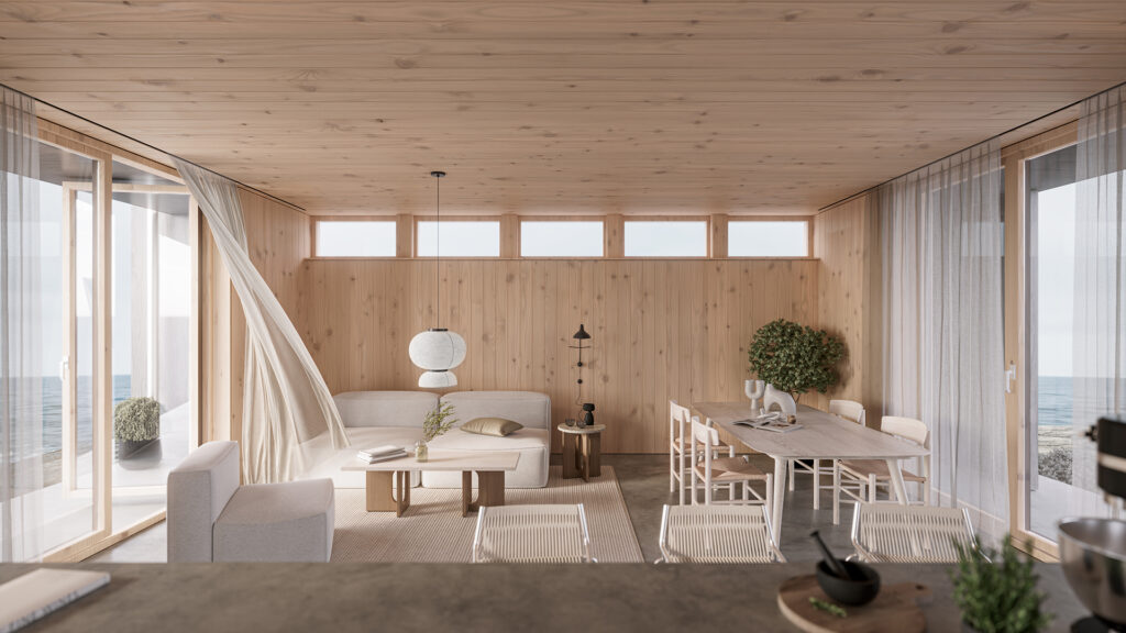 I Kobben lever du i harmoni med naturen och följer årstidernas skiftningar genom de imponerande fönsterdörrarna som sträcker sig från golv till tak. De högt placerade fönsterbanden i gavlarna skapar intressanta perspektiv och ett vackert ljusspel under dagen, samtidigt som de ger frihet att möblera rummen precis som du önskar.